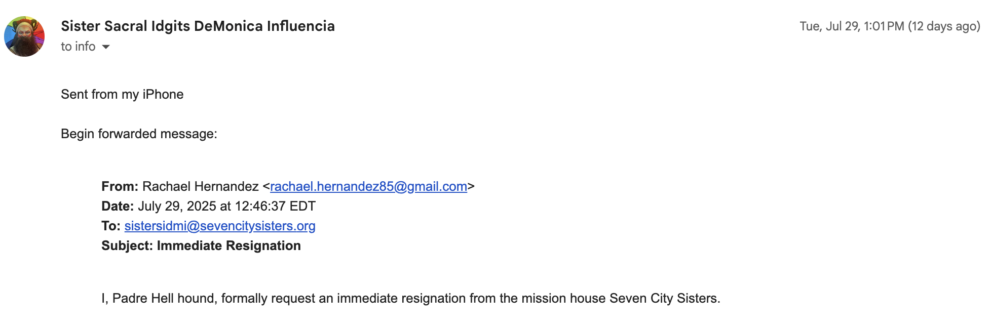 Padre submitted a resignation to Sister Sacral via email on July 29, 2025.